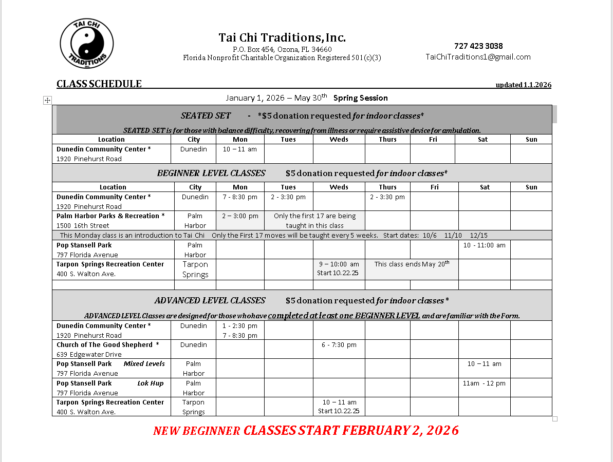 We are now offering a class dedicated to The Tai Chi Seated Set! For info, see Flyer @ BLOG/NEWS/INFO – Tai Chi Traditions, Inc.